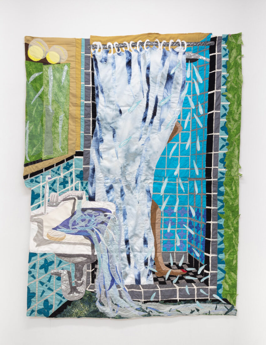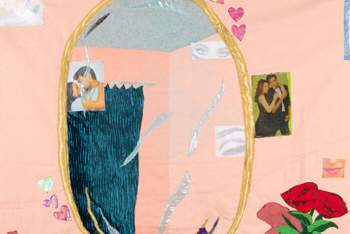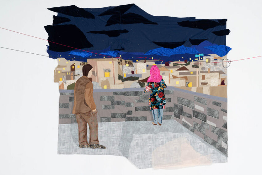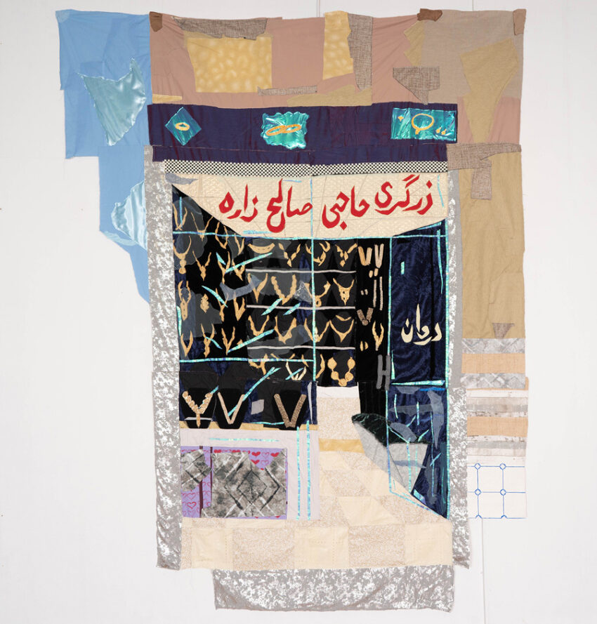 Amiri, whose family fled Taliban-ruled Kabul in 1996 and who now lives in the United States, says her work explores the nature of memory after migration and reflects her wish “to continuously paint the untold stories of Afghan women.” A painter by training, Amiri quilts together vibrant fabrics into large-scale, often wall-sized, pieces. She sources many of her textiles from the Afghani-owned shop A. K. Fabric in New York City’s Garment District and collects others on her travels and from her friends. According to Amiri, the variety of these fabrics—and the complexity of their origins—“resonates with how I think about my identity as a fragmented body or geography that connects me to a world of in-betweenness.”