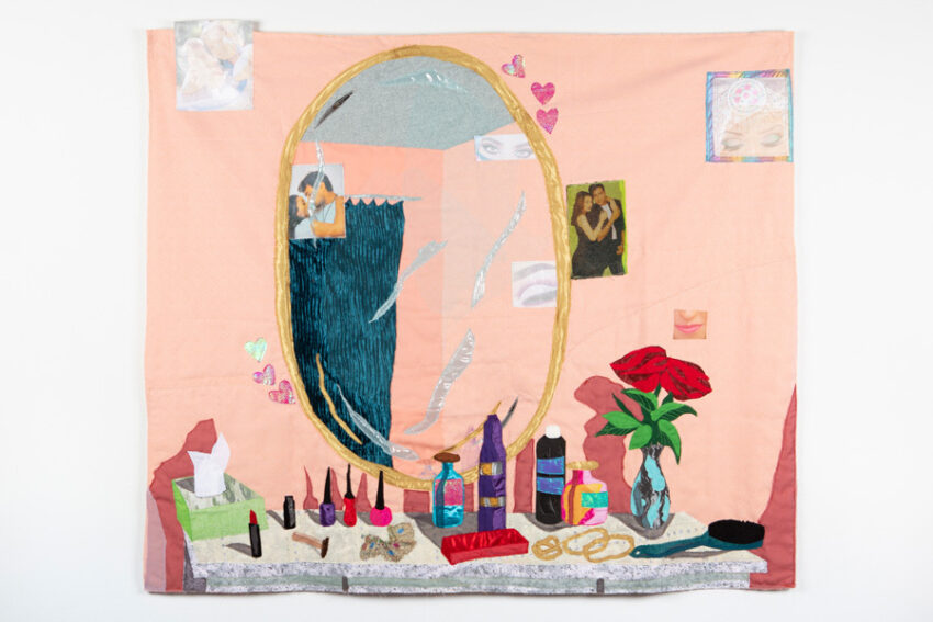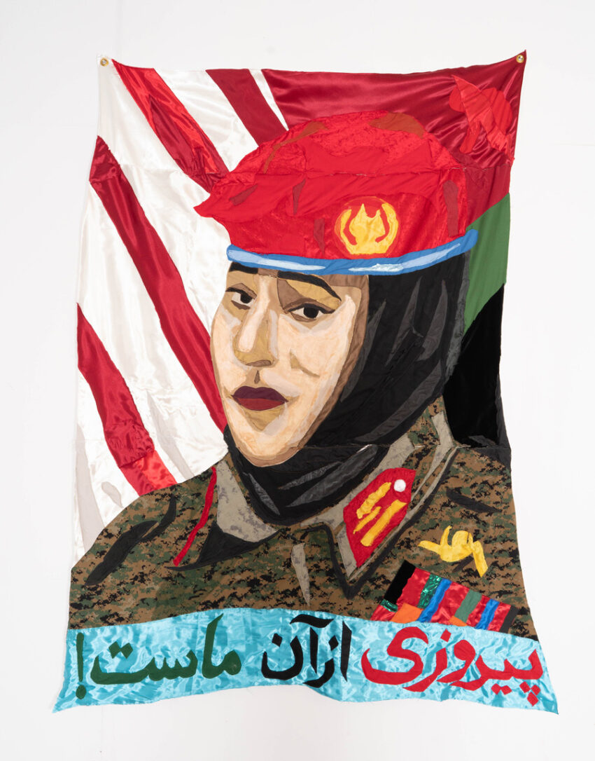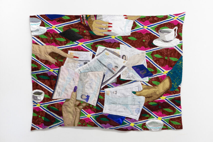 the afghan-born artist Hangama Amiri’s vivid, painterly tapestries explore notions of gender, community, and the essence of home. In her work, the most quotidian places and objects—a nail salon, a vanity, a kitchen table—become sites of cultural remembrance and fellowship among women.