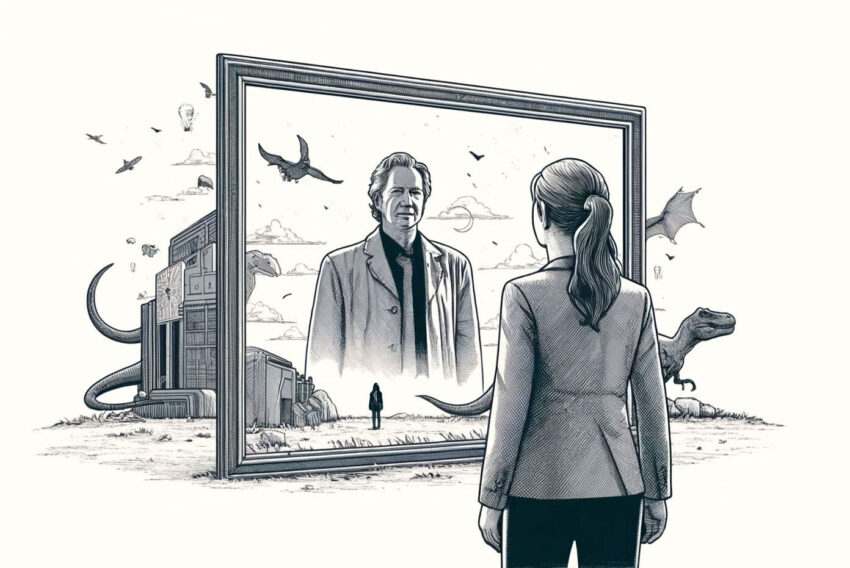 The first time I typed the word mediasaurus, my computer generated a startling autocorrection: medias auras. The ghost in the machinery of the culture industry, a force hard to discern in the jargon of science, seemed to reveal itself in this phrase. The artificial intelligence in my word-processing software named the possibility that books, films, and all kinds of technology generate ambient sensations and have far-reaching but obscure effects. Like the ones that have led me to feel that Michael is somehow inextricable from who I have become. Crichton was a prolific artist who also made himself into a kind of infrastructure, or even an atmosphere. Like microplastics, or trace antidepressants in the drinking water, Crichton is a cultural forever chemical that has fundamentally changed the conditions of existence. The currents of his fantasies have illuminated and redefined my own relationship to reality. Media’s auras enable me to speak with Crichton as well as to speak through him. To paraphrase one of my teachers, you never know which gestations will save the world.