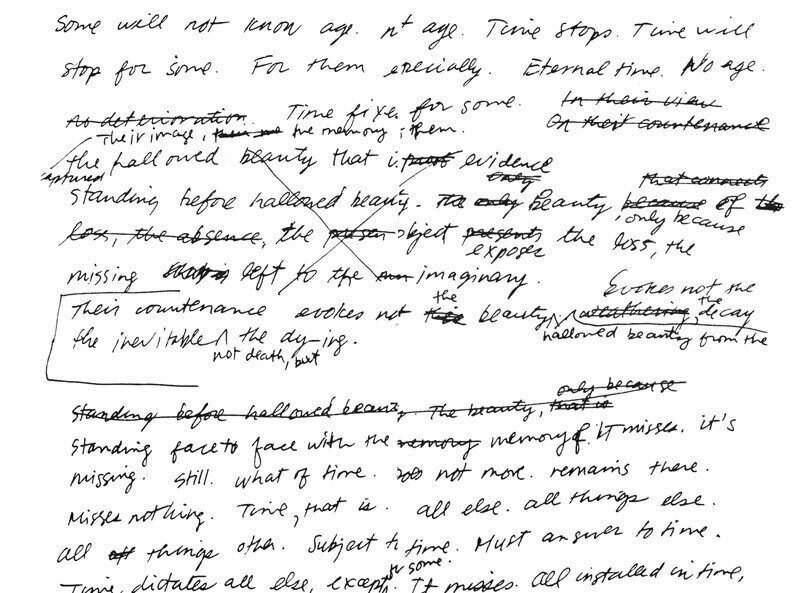 Turn the page, and the words “Some will not know age” appear again, in the arresting spread of Theresa’s handwriting fluidly flowing across the open pages. Here, Theresa’s fountain pen– drawn words, larger than the typescript found elsewhere in the book, claim the space. The handwriting is confident, replete with captivatingly drawn lines or marks drawn over words and across phrases, a large bracket over two lines of text, carets to squeeze in words, and a big X across four lines of sentences. Theresa must have selected these handwritten draft pages because they exude just the right combination of poeticism and gravity.